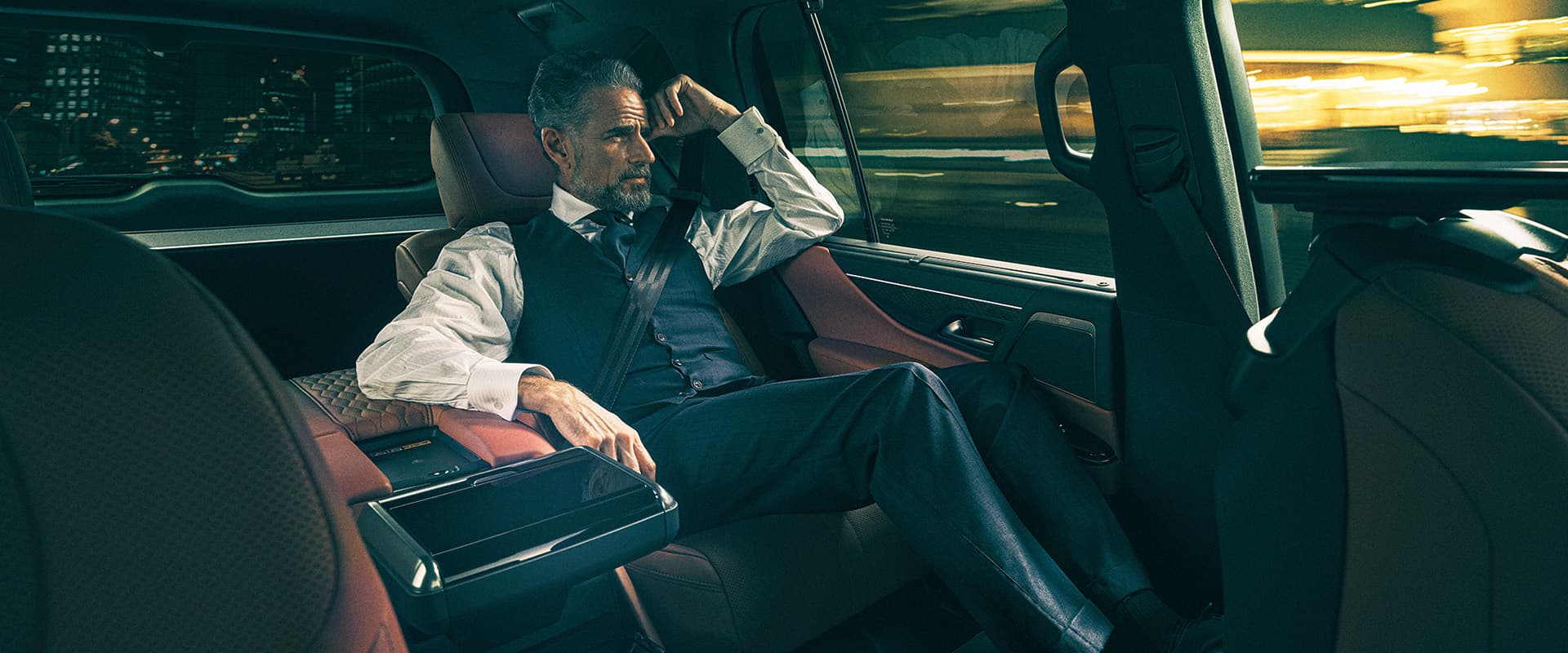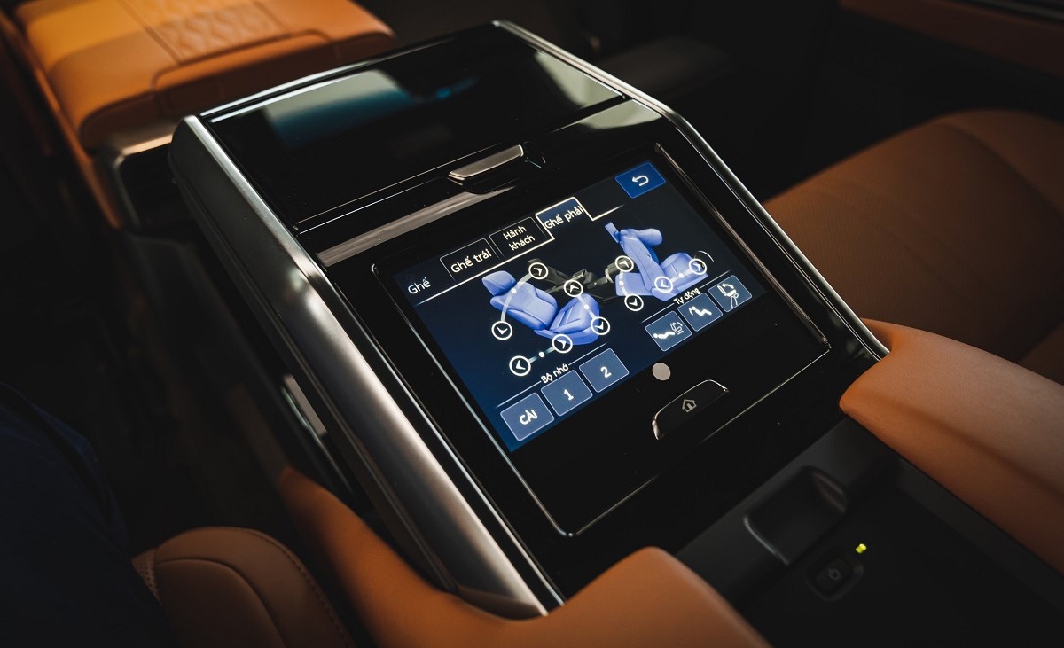 Bảng điều khiển cảm ứng ở bệ tỳ tay trung tâm, tại đây quý khách có thể điều chỉnh độ sáng của đèn đọc sách, ghế mát xa, chỉnh ghế, chỉnh điều hòa, âm thanh, đèn nội thất...