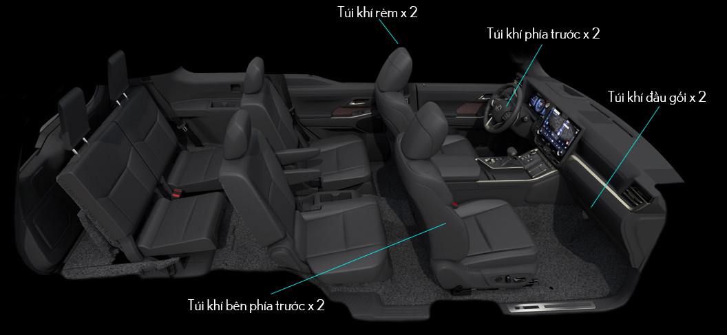 Hệ thống túi khí (SRS Airbags)GX mới được trang bị 8 túi khí mang lại sự an toàn tối đa cho mọi vị trí ngồi trên xe khi có va chạm xảy ra.