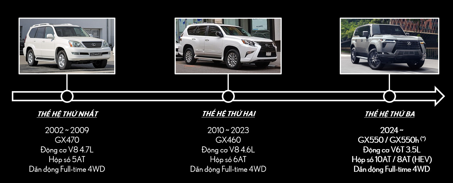 là mẫu xe địa hình nổi tiếng của Lexus, Lexus GX đã ghi dấu ấn trong người dùng yêu Lexus bởi 2 cái tên hết sức quen thuộc, GX 470 ra mắt năm 2002, GX 460 ra mắt năm 2010. Qua hơn 20 năm ra mắt và phát triển sản phẩm, Lexus GX đã ra mắt phiên bản Lexus GX 550 hoàn toàn mới với kiểu dáng hầm hố hơn nhiều so với đời cũ, trang bị ngập tràn công nghệ hiện đại nhất của Lexus.