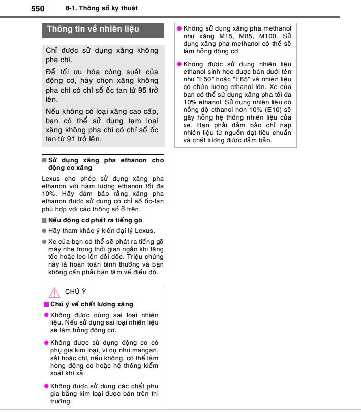 Theo lộ trình từ Chính phủ, từ ngày 01/01/2026, việc sử dụng xăng sinh học E10 sẽ trở thành bắt buộc trên toàn quốc, Và Lexus GX 550 được thiết kế tương thích với xăng E10. Theo sách Hướng dẫn sử dụng (HDSD) của xe, việc sử dụng xăng E10 không ảnh hưởng đến khả năng vận hành, chi phí bảo dưỡng, độ bền hay độ an toàn của xe.