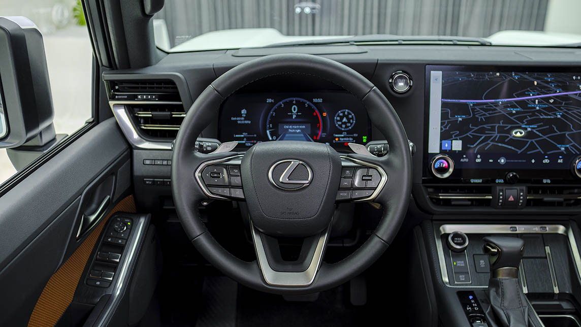 Lexus GX 550M được thiết kế nội thất theo triết lý Tazuna quen thuộc, mắt nhìn đường, tay cầm vô lăng và điều khiển trực quan, nhờ cách bố trí khoa học. Các nút bấm được bố trí thành các vùng riêng biệt phù hợp với hoàn cảnh sử dụng, tạo ra một bố cục chức năng giúp giảm thiểu những thay đổi về tầm quan sát và tư thế trong quá trình vận hành, giúp lái xe thoải mái và an toàn.