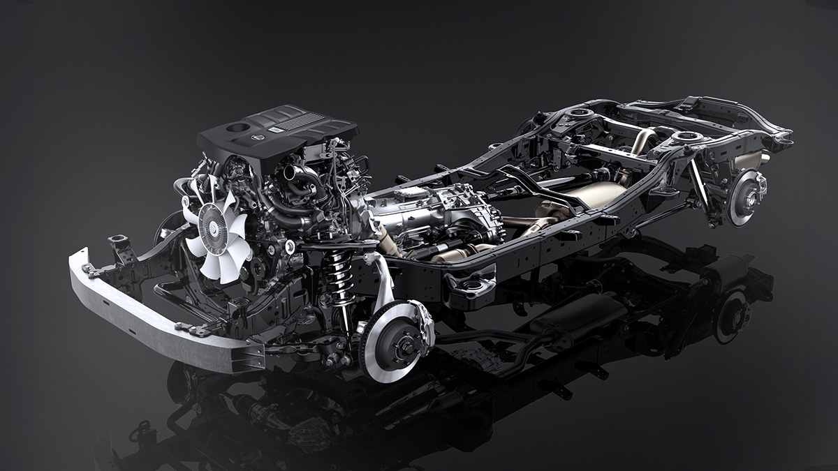 Nền tảng khung gầm GA-F giúp xe nhẹ hơn và cứng vững hơn giúp cải thiện khả năng di chuyển on-road nhưng vẫn đảm bảo off-road mạnh mẽ, đồng thời tăng cường độ an toàn khi va chạm, nâng cao sự yên tĩnh và chất lượng vận hành.