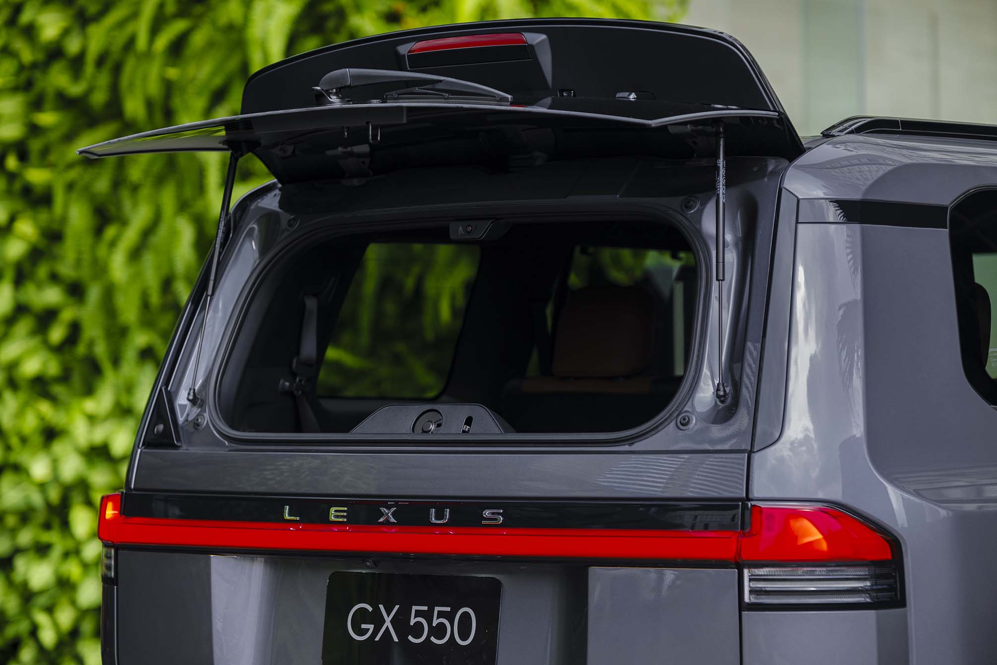 Cốp xe có tính năng mở cốp điện rảnh tay, tuỳ chỉnh được độ cao cốp, và thiết kế phần kính xe vẫn giữ nét truyền thống từ mẫu GX460 thế hệ trước là có thể mở phần kính này ra.