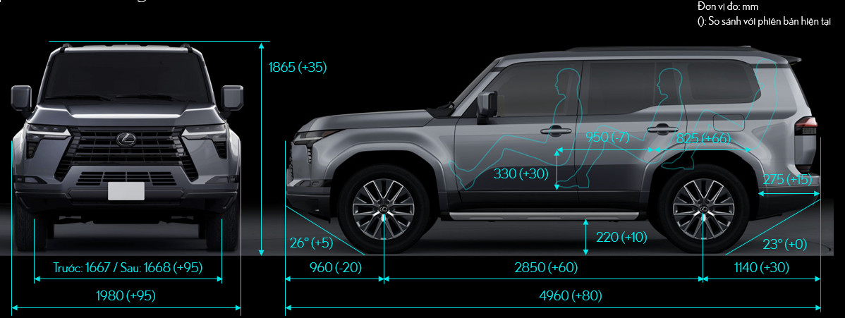 Lexus GX 550 có chiều dài x rộng x cao : 4960 x 1980 x 1865 mm. Với chiều dài 4960 mm (dài hơn 80 mm), rộng 1980 mm (rộng hơn 95 mm), cao 1865 mm (cao hơn 35 mm) và chiều dài cơ sở 2.850 mm (dài hơn 60 mm). Lexus GX 550 được gia tăng kích thước dài, rộng, cao, trục cơ sở và khoảng sáng gầm, nhấn mạnh dáng vẻ bề thế và khả năng vượt địa hình.