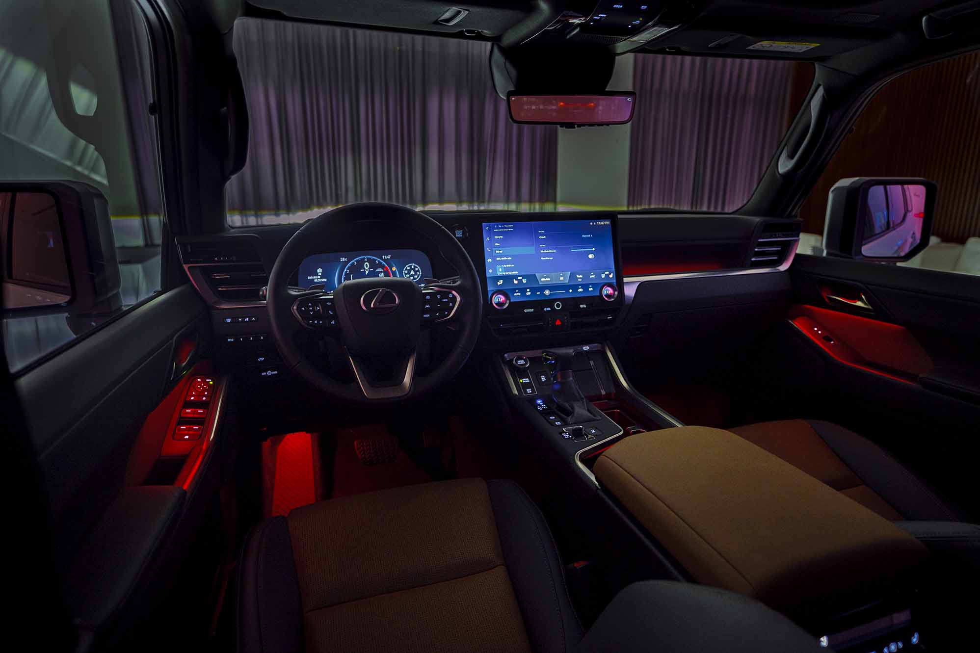 Lexus GX 550 được thiết kế nội thất theo triết lý Tazuna quen thuộc, mắt nhìn đường, tay cầm vô lăng và điều khiển trực quan, nhờ cách bố trí khoa học. Các nút bấm được bố trí thành các vùng riêng biệt phù hợp với hoàn cảnh sử dụng, tạo ra một bố cục chức năng giúp giảm thiểu những thay đổi về tầm quan sát và tư thế trong quá trình vận hành, giúp lái xe thoải mái và an toàn.