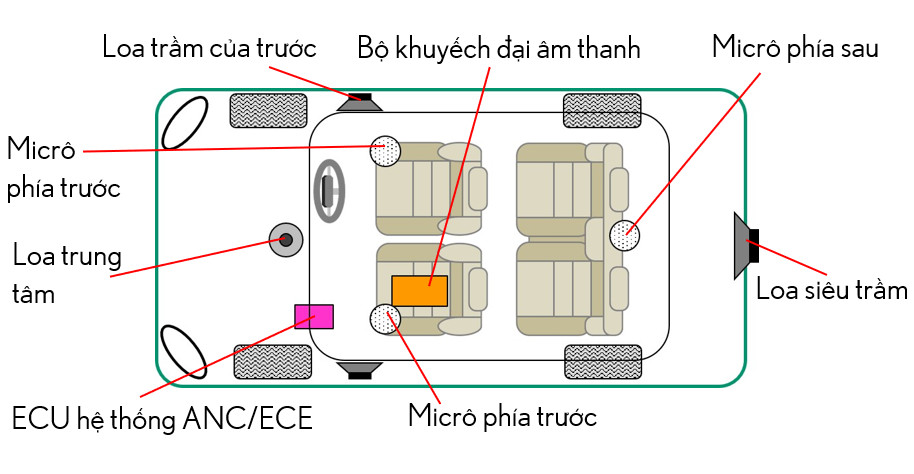 Sóng chống ồn (âm khử ồn) được tạo ra dựa trên tần số điều khiển được tính toán từ tốc độ động cơ (1000-6000 vòng/phút) và thông tin về tiếng nổ động cơ lọt vào cabin do bộ micrô thu thập. Các sóng chống ồn này được phát ra qua loa của hệ thống âm thanh, giúp giảm tiếng ồn bên trong xe. Hệ thống có thể đạt được khả năng giảm âm chính xác cao trong dải tần số từ 30 đến 200 Hz cho đến bậc 8 (8 tần số khác nhau) của rung động quay của động cơ. ANC giúp giảm tiếng ồn nổ của động cơ vốn tăng lên do mở rộng phạm vi khóa để tăng cường tiết kiệm nhiên liệu, mang lại sự yên tĩnh tuyệt vời trong cabin.