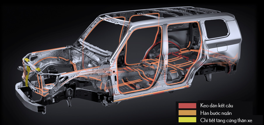 Keo dán kết cấu, công nghệ hàn bước ngắn và cấu trúc bổ trợ tăng cứng giúp nâng cao độ cứng vững của thân xe, mang đến khả năng vận hành ổn định ở tốc độ cao khi on-road và vững chãi khi off-road.