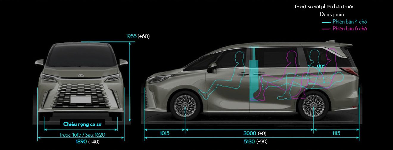 Lexus LM 500h 4 chỗ hiện tại phân phối trên toàn cầu nên kích cỡ xe cũng được thiết kế rộng rãi hơn để phù hợp với kích cỡ cơ thể hành khách trên toàn cầu.