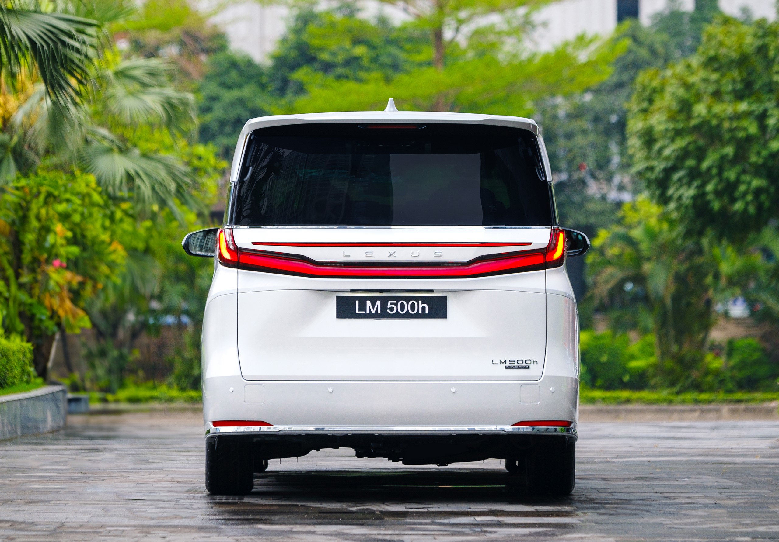 Phần đuôi xe được thiết kế nhấn mạnh chiều rộng và sự bề thế của Lexus LM 500h, với dải đèn chữ "L" đặc trưng mang lại độ nhận diện xuất sắc.