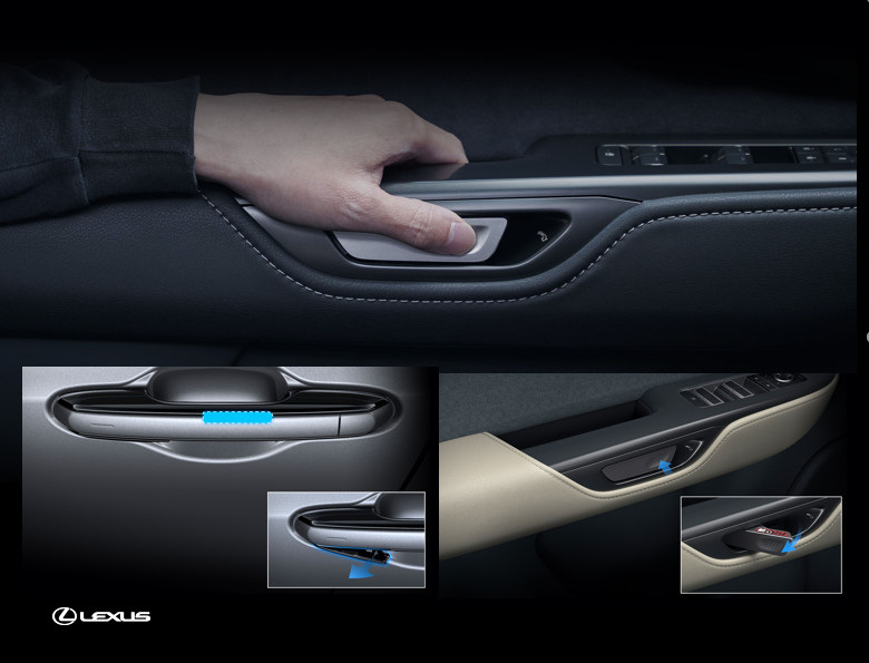 Tiếp theo, trang bị hàng đầu của Lexus, công tắc kiểu bập bênh được sử dụng trên tay cầm phía sau bên ngoài của cửa trượt. Điều này mang đến một hoạt động trực quan hơn cho hành khách. Để đảm bảo an toàn, còi cảnh báo cũng được trang bị trong quá trình vận hành cửa trượt điện và bên cạnh đó là chức năng chống kẹt cửa.