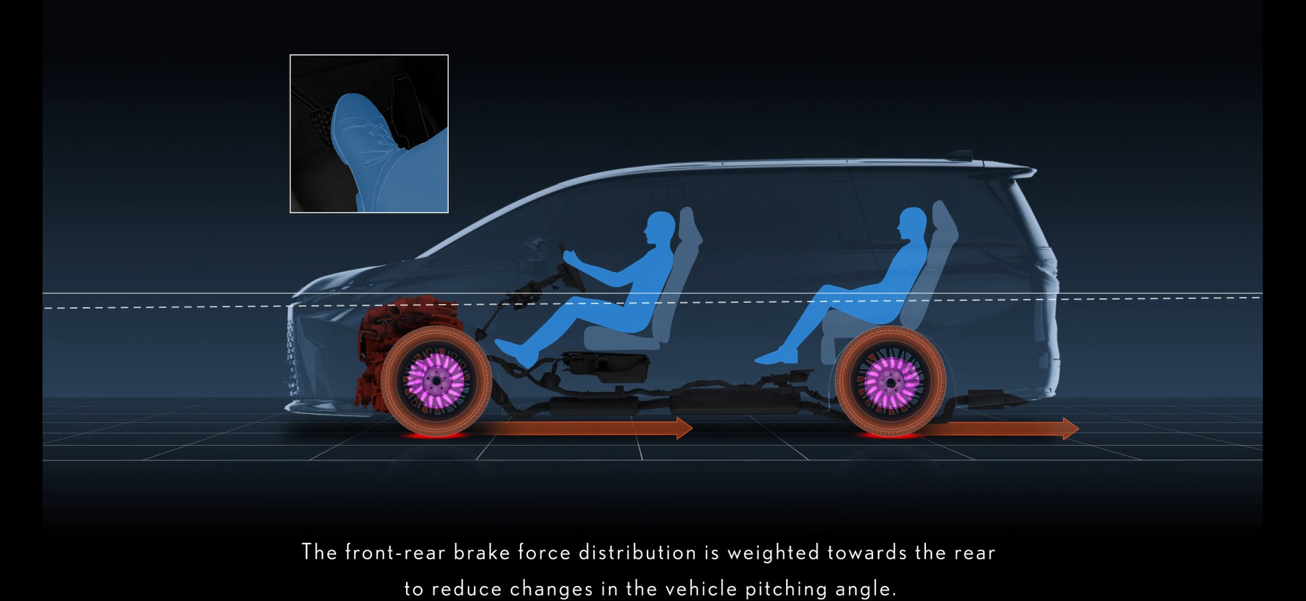 Một tính năng khác được phát triển trên LM hoàn toàn mới là Kiểm soát tư thế xe (Kiểm soát mấp mô thân xe). Trong quá trình phanh, sự phân bổ lực phanh trước-sau thay đổi tùy thuộc vào lực phanh của người lái và tác động theo phương thẳng đứng của hệ thống treo. Lực phanh được dồn về phía sau để giảm sự thay đổi độ cao và ngăn chặn lực nâng đuôi xe, do đó cải thiện chất lượng di chuyển của hàng ghế sau và giảm thiểu chuyển động từ trước ra sau.