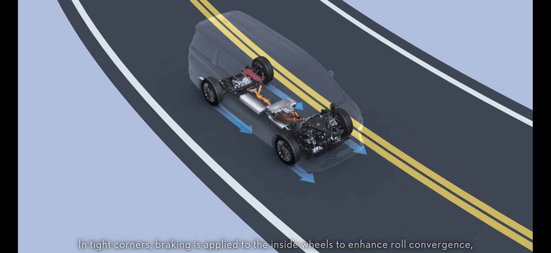 Trong khi vào cua, Hệ thống Kiểm soát tư thế phanh xe (Kiểm soát lật ngang) sử dụng hệ thống phanh của xe để ngăn chặn tình trạng lật ngang và giữ ổn định tư thế của xe. Hãy tưởng tượng rằng ô tô đang rẽ trái, khi cảm biến gia tốc ngang phát hiện xu hướng lật, hệ thống sẽ tác dụng lực phanh lên bánh sau bên trong để tạo ra một lực chống lại lực nâng thân xe một cách hiệu quả, từ đó giảm xu hướng lật ngang của xe. Điều này góp phần tạo sự thoải mái khi lái xe và tư thế xe ổn định.