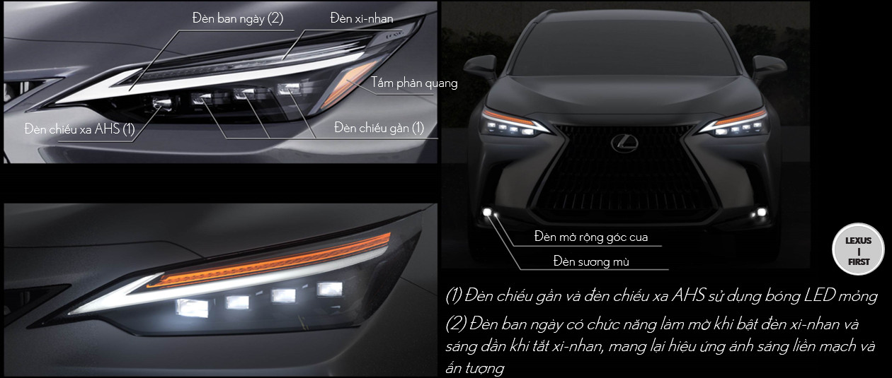 NX 350 F SPORT sử dụng cụm đèn full LED với công nghệ AHS, đèn tự động thích ứng. với công nghệ bật tắt các chip LED tại những điểm có phương tiện để tránh làm chói mắt các phương tiện đi cùng chiều hay ngược chiều, một tính năng rất nhân văn của Lexus.