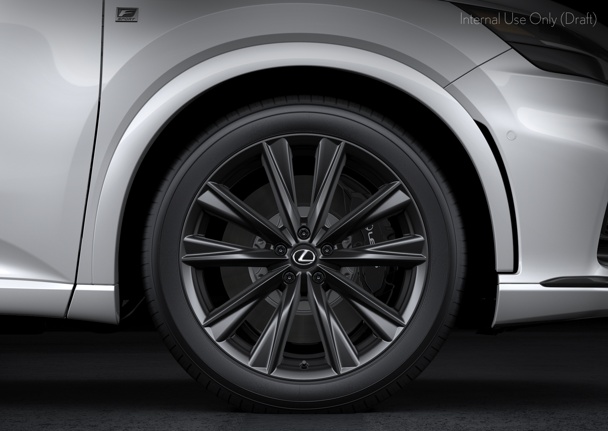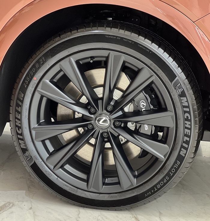 Vành xe RX 500h F SPORT Performance có kích cỡ 21 inch, to bản, được hoàn thiện với nước sơn đen sần thể hiện sự thể thao, sang trọng cho mẫu xe.