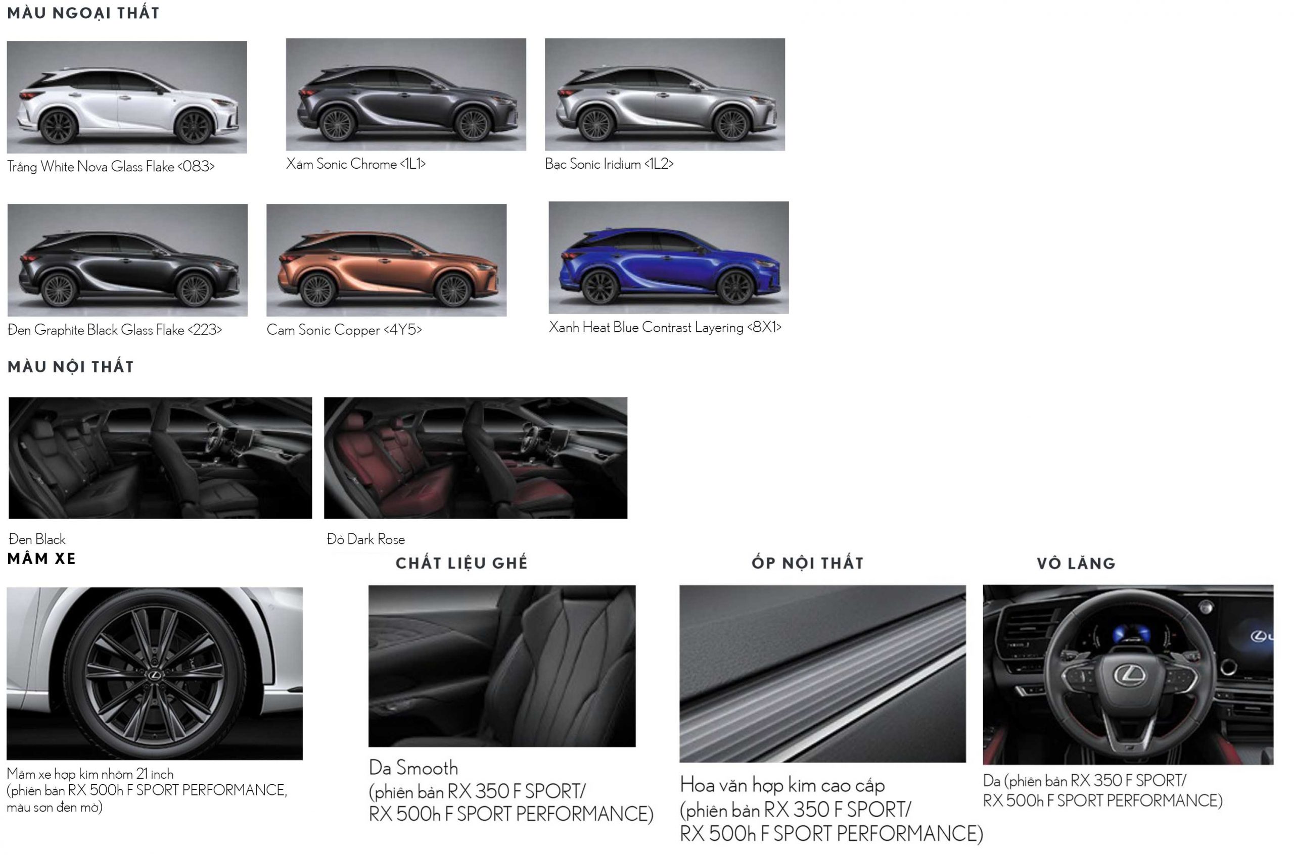 Lexus RX 500h F SPORT Performance có tổng cộng 6 màu ngoại thất và 2 màu nội thất .